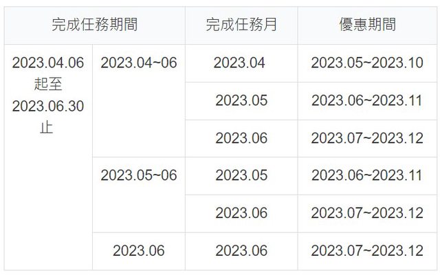 優惠期間:完成專案任務之次月1日起開始適用本專案利率,為期6個月(加碼年利率0.25% 之部分,活動及優惠期間僅至2023/06/30止)。 https://i.imgur.com/nyveuIG.jpg