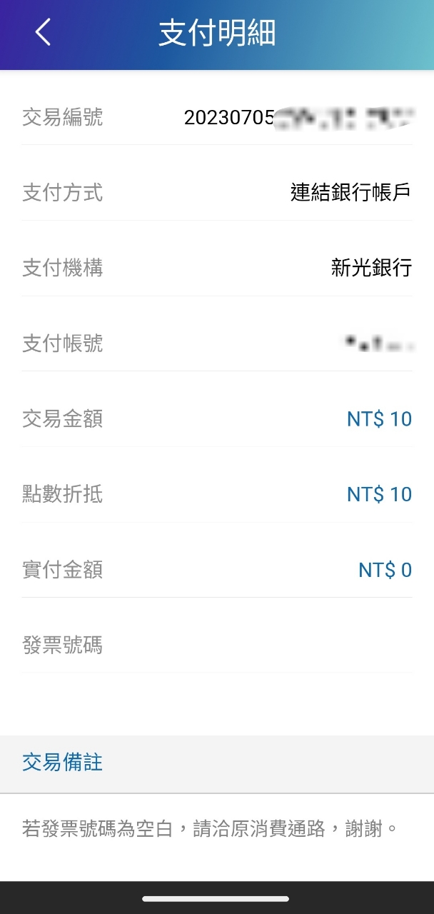 zetazko: 交易紀錄是連結新光帳戶 支付0元 XD 07/05 01:28