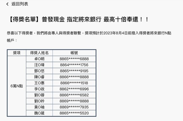 標題[情報] 將來銀行 六萬元中獎名單出爐!