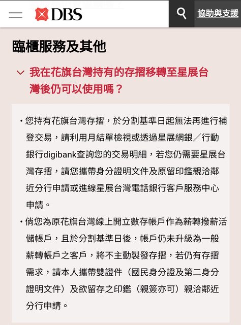 來和板大們分享一下後續。首先還是感謝協助處理這些事情的行員跟客服人員/客戶關係 代表。 後續就是越想越虧,然後客服持續滿載,只好跑去找金管會銀行局協助處理這件事了。 (不是很想這樣直接找主管機關,但謝謝星展讓我開啟這道大門。) 這幾天有撥入客服請客服協助申請smart帳戶和活存帳戶存摺。後續接到往來分行來電表示 smart帳系統發不出摺,活存帳戶和我確認過已經領到了。 (我怎麼印象中哪位板大分享說某客服表示電話客服中心只能協助申請smart帳戶存摺, 其餘要到分行臨櫃。) 也在最近收到了之前再度申請的Debit Card,帳號主帳號就是活存那個帳戶。有空再去 開卡,希望不要遇到什麼問題。終於可以正常提領了嗎!至於要把副帳號資訊寫入晶片內, 還是要撥空跑趟分行了。 另外這兩天也接到星展電話回覆表示有收到我和銀行局反映的事情,也在電話中頻頻道歉 表示剛接手花旗這麼龐大的業務移轉情況比較混亂。至於之前收取的手續費承諾會退回。 剛剛查詢也已經入帳了。 關於smart帳戶轉換方面,因為會提供月結單,所以轉換過後還是維持無摺帳戶,無論是不 是有到過分行留過印鑑。 另外其他帳戶如果要換發存摺還是需要跑一趟分行確認身分申領,沒辦法透過電話客服 申請。 (這麼這次講的又不一樣?) (合併移轉專區資訊:嗨~ https://i.imgur.com/XqvTegO.png
