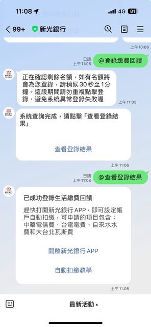 提醒各位新光的會員任務可以登錄了, 2023年12月登記時間:2023年12月05日至2023年12月31日 小弟我11月底綁定,所以這個月還是金級會員, 生活帳單自動繳費享10% LP點數回饋,反正不拿白不拿, 已成功登錄,名額-1 https://i.imgur.com/zhr9M5f.jpg