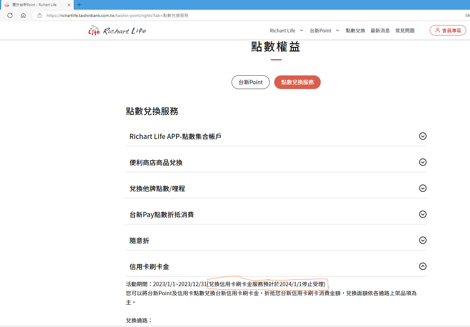 TZUYIC: 2024/01/01到了,台新Point直接兌換刷卡金項目準時下架。 01/01 12:46