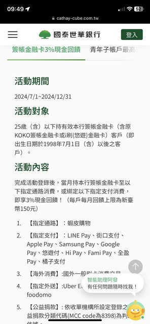 標題[情報] 2024 Q3國泰青年子帳戶/簽帳卡優惠