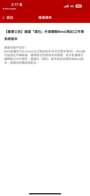 噓 rz759: 共三小,BETA版本來就有機率有些app不能用,銀行只是建議 08/23 16:57