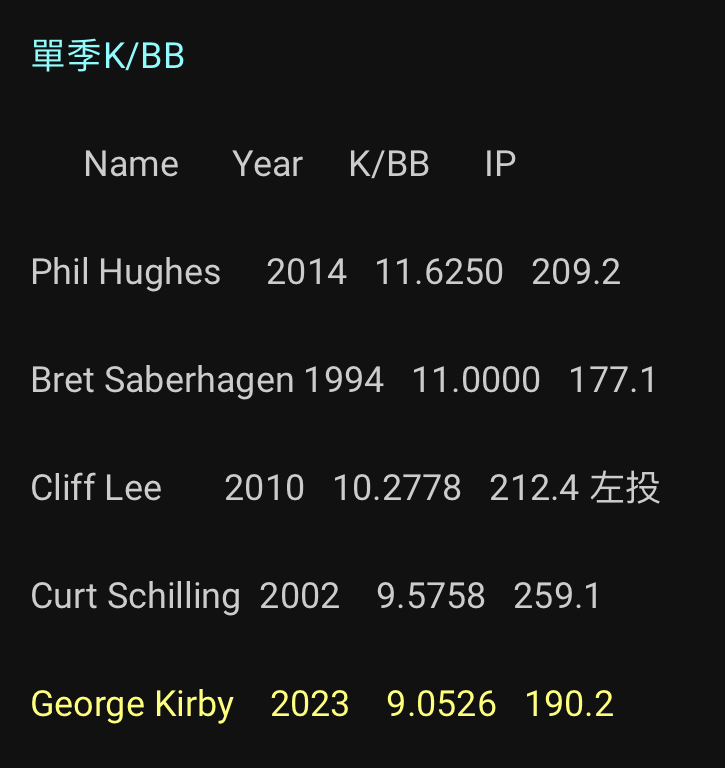 原文恕刪 這篇我覺得吹得有點大啦 其他部份我先保留 只看他的控球 山本去年和前年BB/9大概是2上下 今年進步了來到1.86 假設這老哥這麼厲害能無痛轉換上大聯盟 1.86大概跟小熊王牌Steele一樣在超過100局的投手中排13 確實優秀 再來看到模板之一 Zach Eflin 今年BB/9 1.22 另一位更可怕 BB/9 0.9 他叫 George Kirby 這位粉紅惡魔(X)的控球有多誇張呢? 當初球探報告給他的Command來到60/70 生涯BB/9 1.15 是百年來的控球奇才 排行1923~2023年超過300局的投手中最低的(沒辦法他只投了300局) 其中第2和第3甚至是後援投手 今年還投了一場九局0ER 7K 3H 0BB 但最後水手還是輸球 那場國王在現場發動靈氣 以下列出一些投手的生涯BB/9 George Kirby 1.15 Ryan Yarbrough 1.68 (大谷新隊友 單純沒想到他這麼低) Miles Mikolas 1.7 (捏) Greg Maddux 1.79 (瘋狗 4屆賽揚;1997 BB/9 0.77) Curt Schilling 1.85 Roy Halladay 1.88(大夫 也是以控球精準出名) Cliff Lee 1.94 (2010 BB/9 0.76) Zach Eflin 1.97 黑田博樹 1.99 Mike Mussina 1.99 Kyle Hendricks 1.99 超過2就不列了 分享一些BB/9的數據 當然有上修的空間 打這麼多只想讓大家知道卡比控球有多好:3 -- https://i.imgur.com/06iVajw.jpg