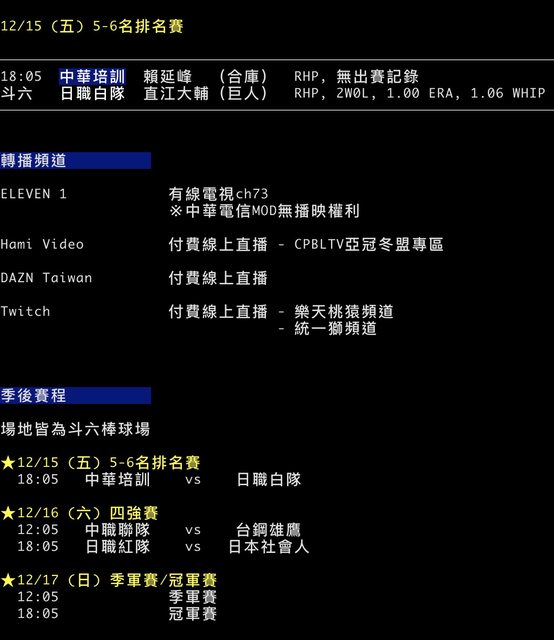 標題[情報] 冬季聯盟 12/15 預告先發 (排名賽)