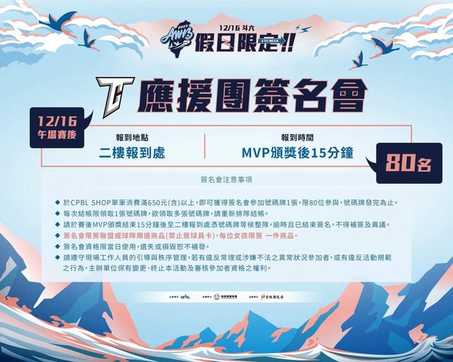 ✓於CPBL SHOP單筆消費滿650元(含)以上,即可獲得簽名會參加號碼牌1張,每場次限80位?