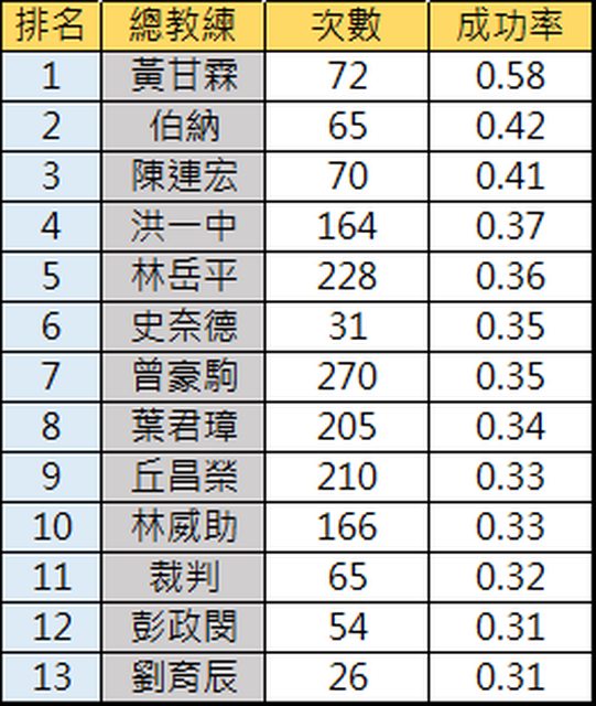 今年各隊的挑戰次數/成功率