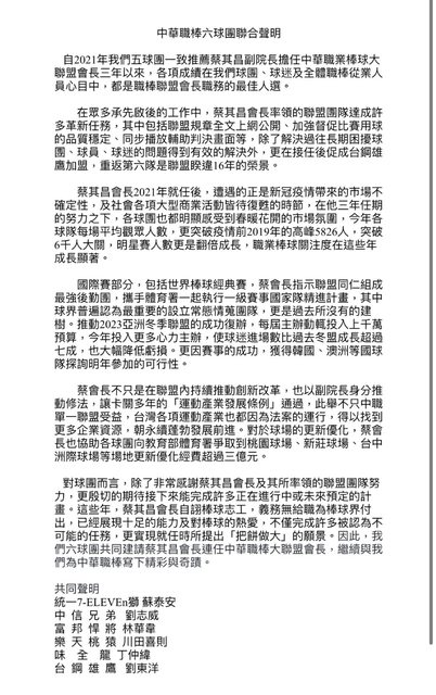 中職六球團發布聯合聲明:我們六球團共同建請 #蔡其昌 會長連任中華職棒大聯盟會長