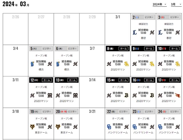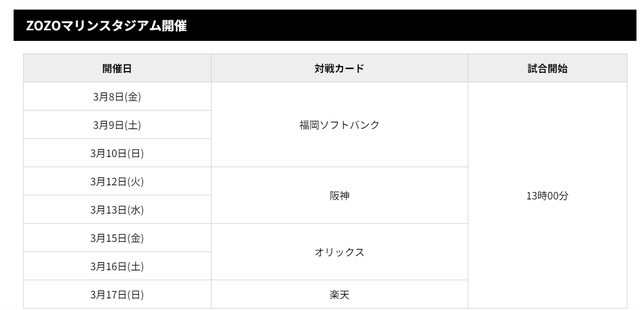 千葉羅德海洋稍早公佈2024年球季熱身賽賽程 在ZOZO球場的時間 3/8~3/10 對上福岡軟銀 3/12~3/13 對上阪神虎 3/15~3/16 對上歐牛 3/17 對上楽天