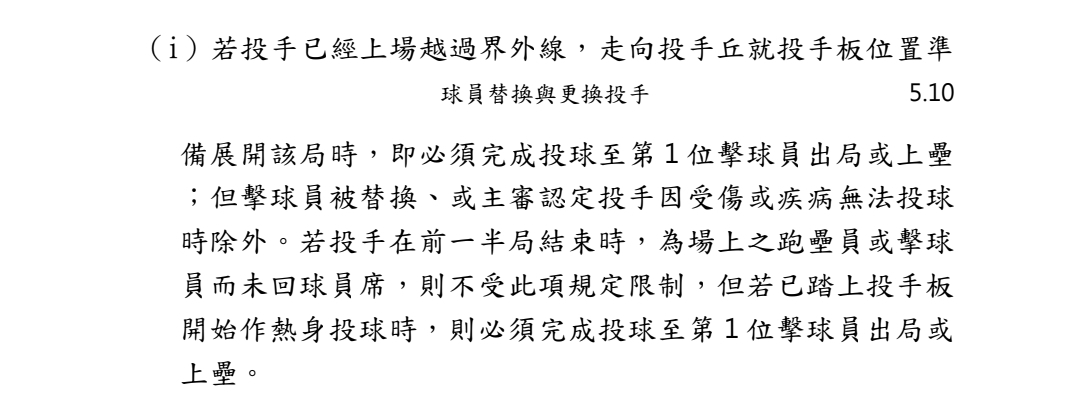 otaku32286: 看原文的第三點應該是指局間換投時,若新投手在剩不到 12/22 04:04