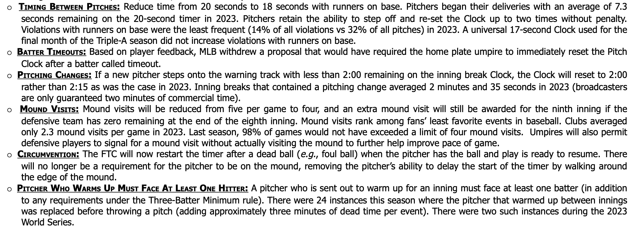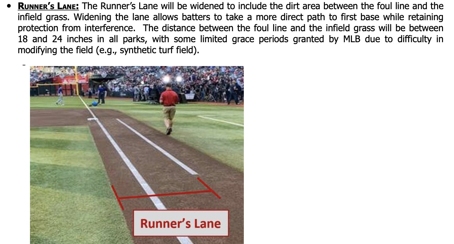 News: MLB competition committee approves changes for the 2024 season including: -18 sec clock with runners on -4 mound visits, down from 5 -If a P starts to warm up before an inning, he must face at least one hitter. -The runner’s lane to first has been widened to the inf grass 這是其中四項 1.跑者上壘後的投球時間限制縮短至18秒 (原本20秒) 2.單場各隊投手丘訪視減為四次 (原本五次) 3.如果有投手開局前熱身 他至少要上來面對一名打者 4.擊球跑壘員往一壘的合法預計跑壘路徑加寬 (如下圖紅線區標示) https://pbs.twimg.com/media/GB5SiGNX0AANxPr.jpg