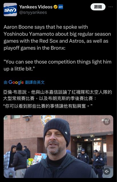 總欸跟山本描述季後賽洋基球場的氣氛 讓山本有點興奮 https://i.imgur.com/cRJovxb.jpg