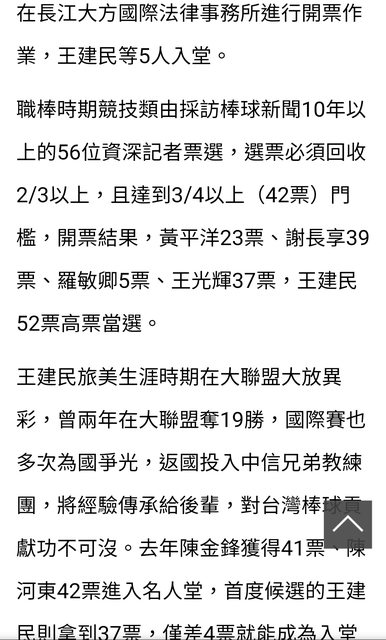 由採訪棒球新聞10年以上的56位資深記者票選,選票必須回收2/3以上,且達到3/4以上(42 票)門檻,開票結果,黃平洋23票、謝長享39票、羅敏卿5票、王光輝37票,王建民52票高 票當選。 -- ※ 發信站: 批踢踢實業坊(ptt-website.tw), 來自: 1.200.171.145 (臺灣) ※ 文章網址: https://ptt-website.tw/Baseball/M.1705045882.A.4A8