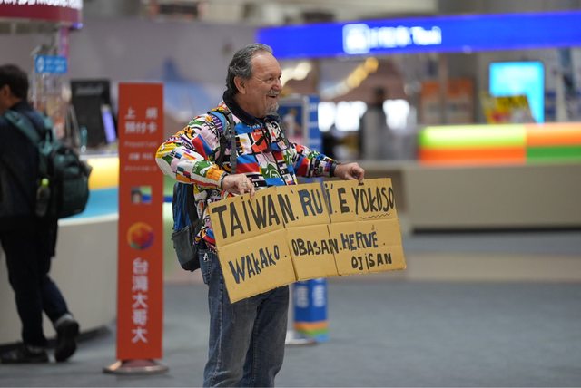 オコエ瑠偉的法籍姨丈拿著看板到桃園機場迎接他。李亞璇攝