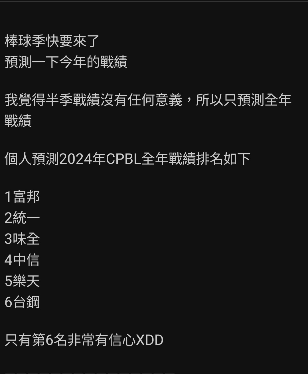 噓 ohfae0728: 宇宙邦明明上下半季都是冠軍好嗎 會不會預測阿 03/04 20:17