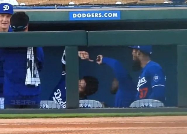 谷翔平也被直擊賽前在休息區做出「合體術」動作。與他「融合」的道奇隊助理體能教練