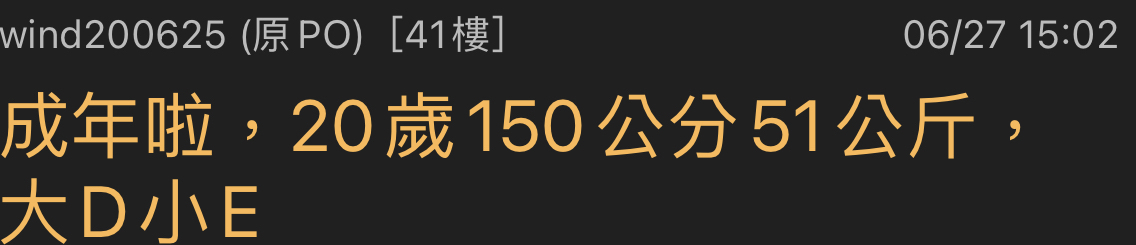 → wind200625 : 成年啦,20歲150公分51公斤,大D小E06/27 15:02