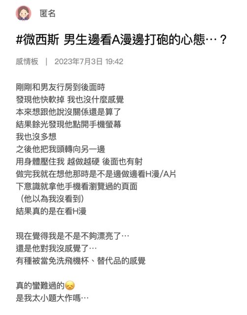 大家可以接受另一半一邊從事性行為 還一邊看片嗎?? 如果對方在事先告知的情況下可能還可以接受 但這種不告訴對方直接自己點開手機看的行為也太不尊重人了吧== 而且原本還是在快軟掉的狀態 整個會讓人更受傷耶 想問各位做這種事 真的是因為另一半沒有吸引力了嗎? https://i.imgur.com/3fgYPCv.jpg