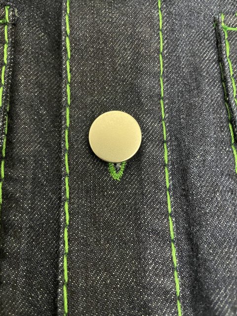 衣服上的所有扣眼都有綠色縫線!拼接的部分都是藏線縫起來的,綠縫線只是裝飾