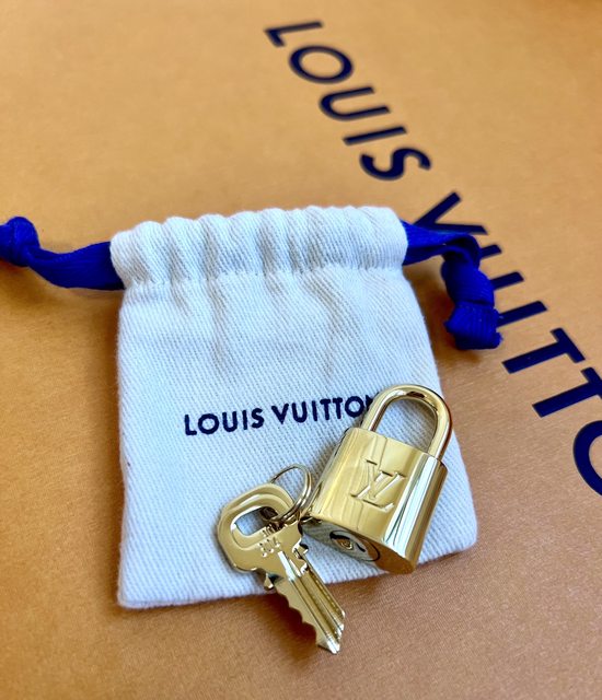 包、米色肩帶、鎖頭和鑰匙。