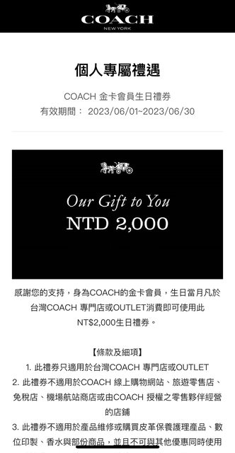 標題[分享] 贈送Coach 金卡生日禮金2000元-已送出