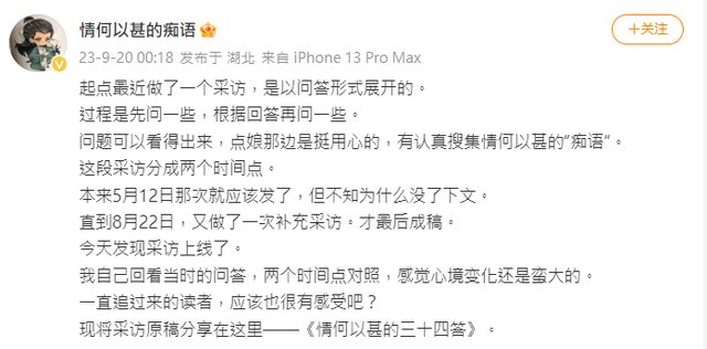 貼一下甚大的微博,起點採訪~ https://weibo.com/5931429455/Nk4wvcBy8 https://i.imgur.com/Rw5E6dE.png