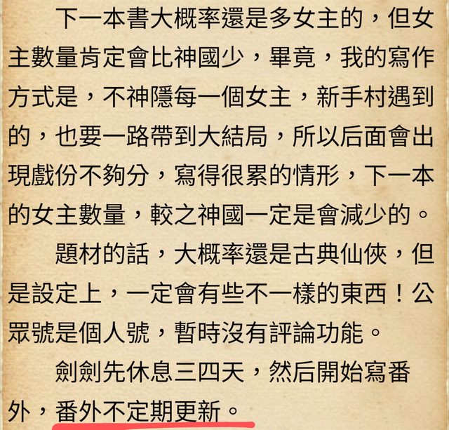 作者在完本感言上說會寫番外篇