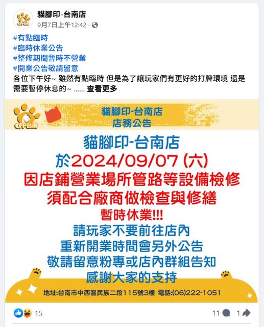 九月初台南店臨時發出店鋪檢修公告,重新營業時間另行告知