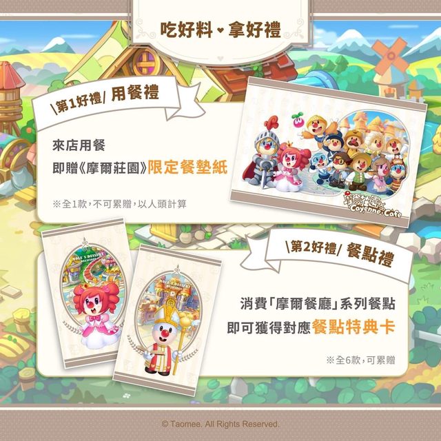 ● 餐點禮:消費「摩爾餐廳」系列餐點,即可獲得對應餐點特典卡。