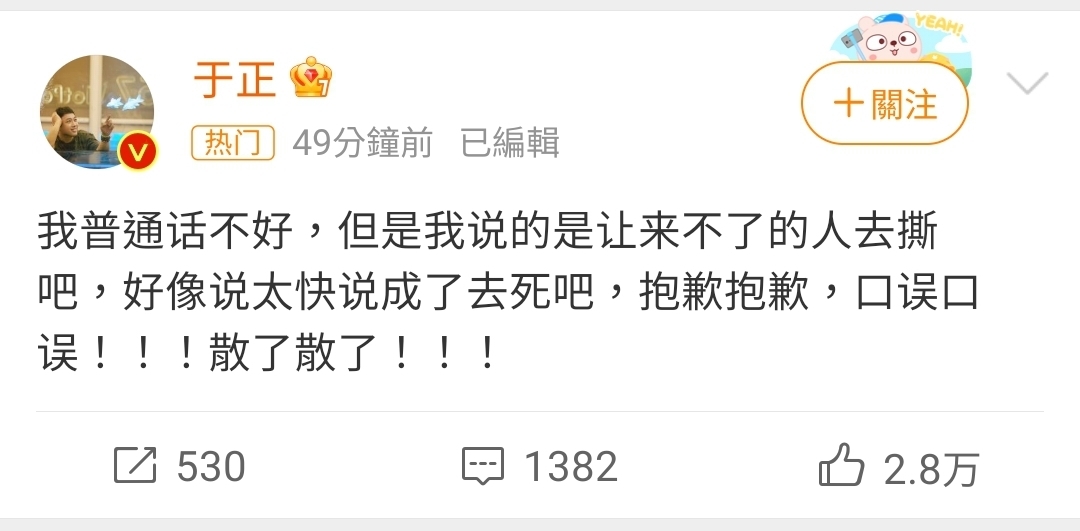 → a86851247: 于正出來說他普通話不好 又黑紅了一波01/19 15:54