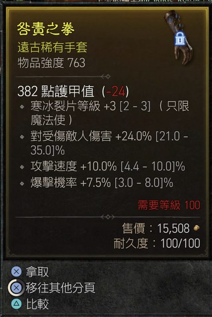 手套100級,冰片3/3、爆擊機率7.5/8、攻速10/10