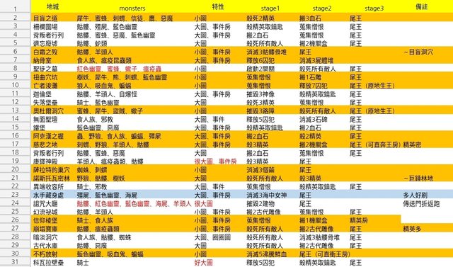 30個地城,沒錯吧?! 用平板Excel打的,打怪用PS很忙XD H腿短的死靈屍爆髒水角度紀錄 邊打邊筆記,都打2X層才有餘力筆記 精英手動血霧,小怪給小弟打,本人在平板打字 大小圖之分有點主觀,給各位參考 怪物的名字有時候分不出種類 有錯的部分再請版友幫忙勘誤一下 http://i.imgur.com/vPSa9LM.jpg