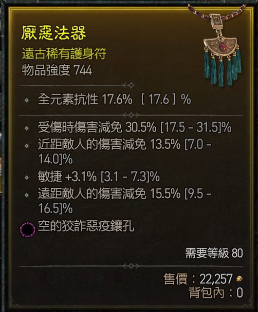 標題[競標] D4 賽季 3近頂減傷 項鍊 紫孔
