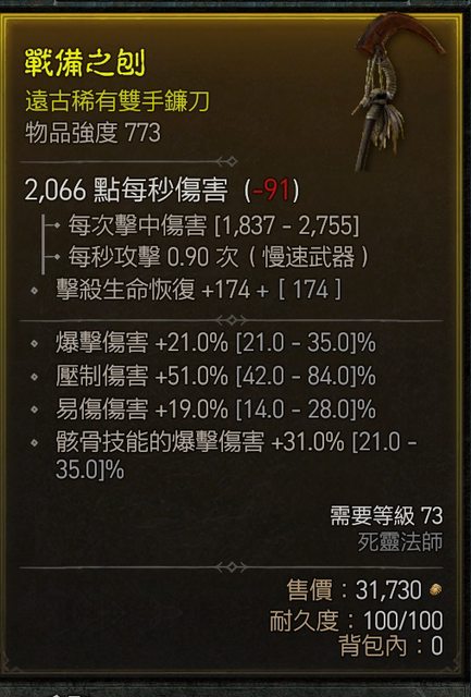 物 品:死靈雙手鐮刀 雙爆傷 易傷