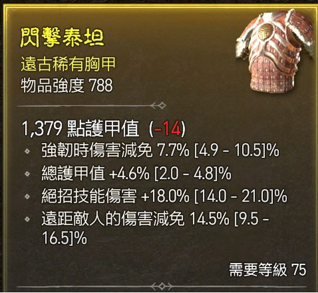 物 品:D4 S1 胸甲 (護甲值4.6%/遠減14.5%/強韌傷害減免7.7%)