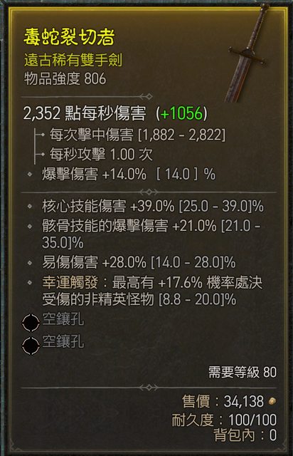 標題[競標] D4 S1 死靈雙手劍 806 頂易傷 頂核心傷