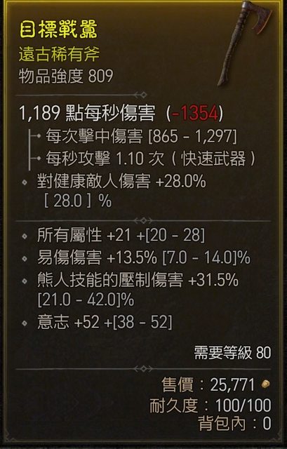 物 品:809山風狼專用單手斧 頂意志/近頂易傷/全屬