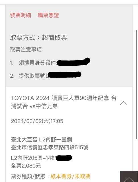 標題[售票] 3/2 讀賣巨人vs中信兄弟 內野上層 1張