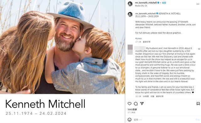加拿大男星肯內特米歇爾(Kenneth Mitchell)於美國時間上周六(24)離世,享年49歲