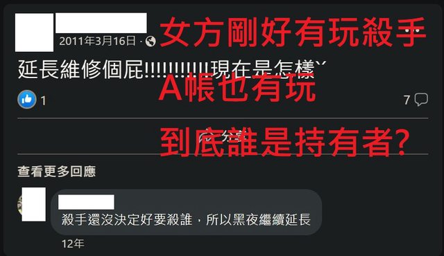 A帳號13年前在殺手遊戲版密集發文,同時期查看老婆的FB帳號也有殺手遊戲的相關文章