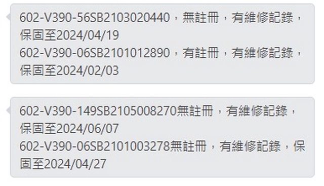 1.購買於2021/06,購買證明遺失未註冊,保固狀態至2024/06,升級4090換下無挖礦,純遊 戲卡,卡況漂亮無氧化生鏽,完整盒裝。 2.保固至2024/04/27,原廠送修後換新卡,已有客服對話證明,全新未使用膠膜未撕,盒裝 不對序號。 3.保固至2024/06/07,有維修紀錄礦卡,無原廠拒保紀錄,返回後僅測試,盒裝不對序號。 4.保固至2024/02/03,有維修紀錄礦卡,無原廠拒保紀錄,返回後僅測試,盒裝不對序號。 5.保固至2024/04/19,有維修紀錄礦卡,無原廠拒保紀錄,返回後僅測試,盒裝不對序號。 以上皆附上客服對話及維修原因