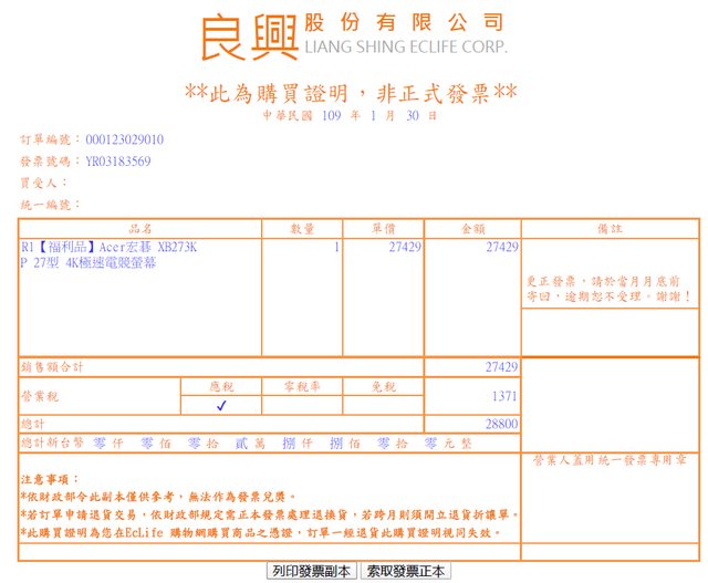 2. 2020/1/30良興購入,購入時為拆封福利品,但購入時幾乎全新且功能正常