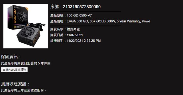 1. 2021/7月購買,保固至2024/7月 (EVGA二手電供保3年)