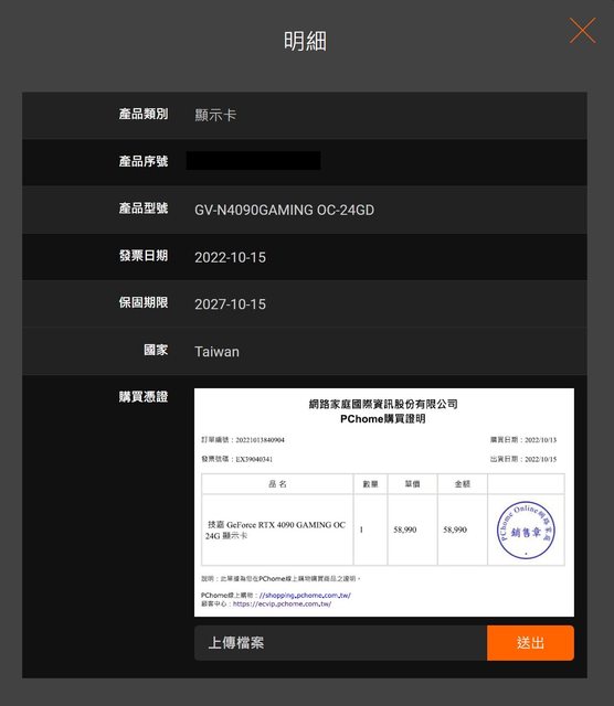 1. 2022/10/15自PCHome購入,五年保固至2027/10/15