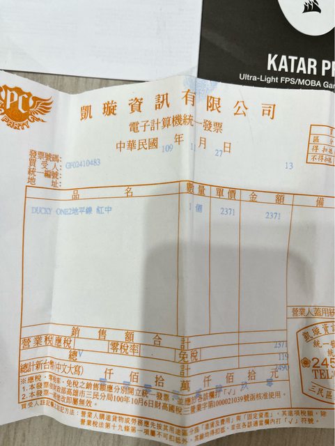 主機和零件是2020年11月22號於高雄建國欣亞購買