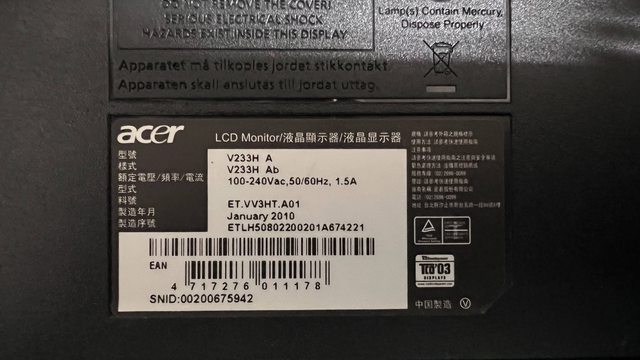 @硬體型號:Acer 23吋 LCD FHD 液晶螢幕 V233H