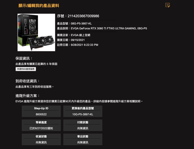 已售出 2.Evga RTX 3060 Ti FTW3 ULTRA GAMING 08G-P5-3667-KL