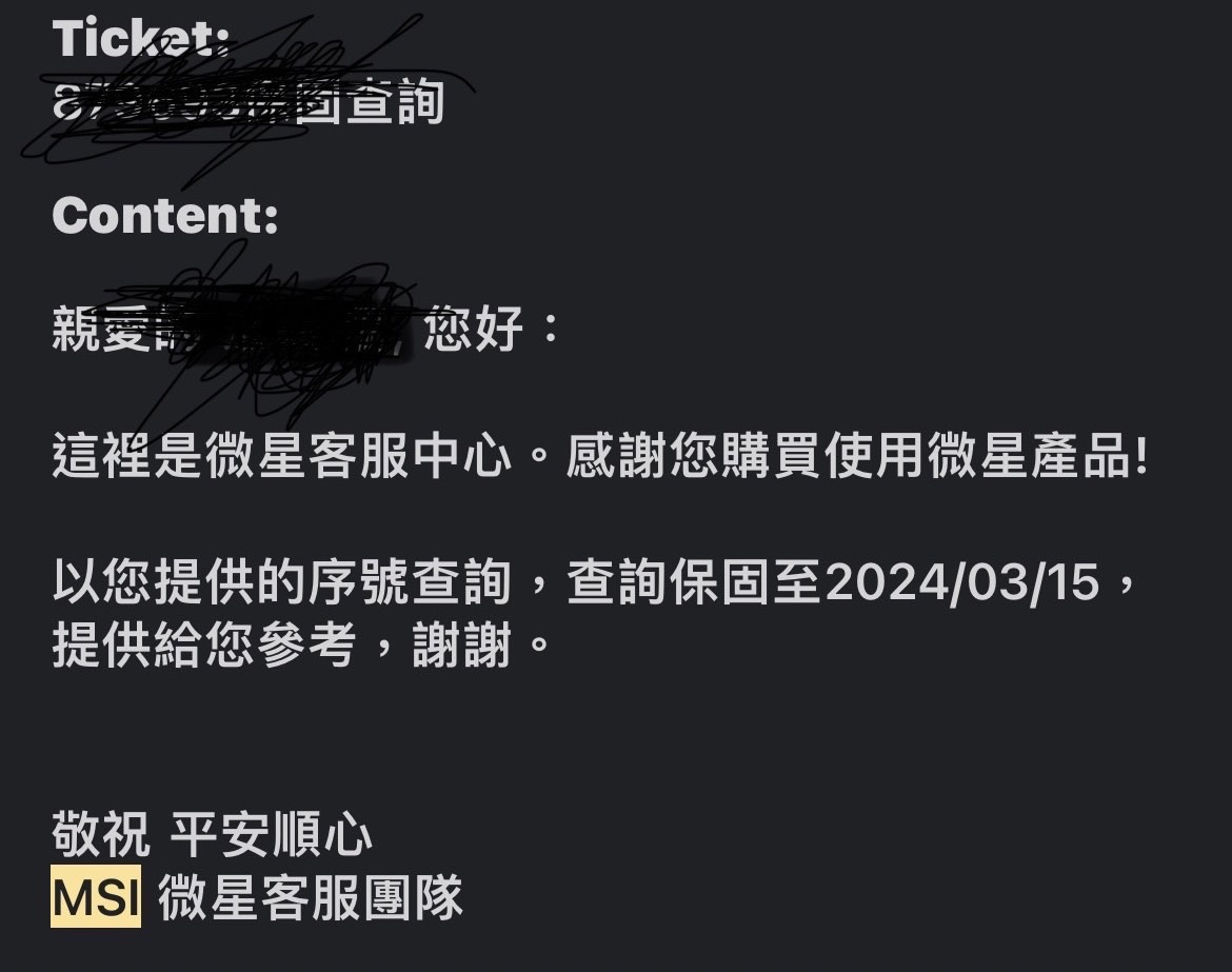 保固狀態有拿顯卡序號詢問官方,回信到2024/03/15,供參考。