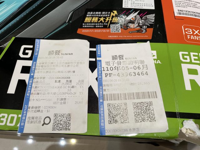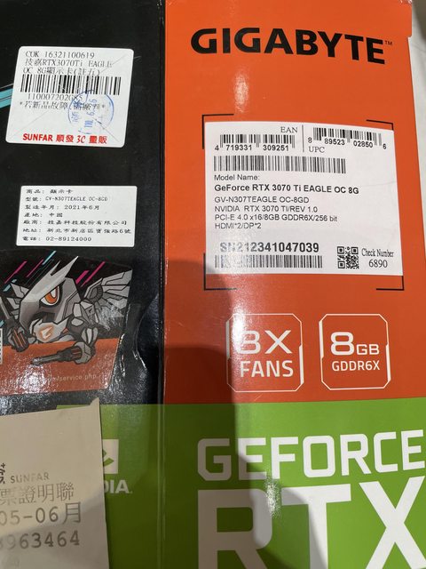 硬體型號:技嘉Gigabyte 3070 ti eagle 欲售價格:9500 品樣狀況: 1.購買日期 2021/6/26 2.保固到2026/6 3.只玩遊戲無挖礦、無生鏽 4.盒子、發票都在 5.卡況良好面交現場看 佐證資料: